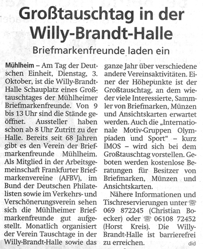 Großtauschtag der „Briefmarkenfreunde Mühlheim am Main e.V.“Am 03.10.2022, einen Montag, veranstaltet unser Verein wieder seinen traditionellen Großtauschtag von 9.00 - 13.00 Uhr (Saalöffnung ist bereits um 8.00 Uhr) in der Willy Brandt Halle, Dietesheimer Str. 90, in 63165 Mühlheim am Main. Die Briefmarkenfreunde sind jetzt im 67 Vereinsjahr und haben sich in der Stadt und in der Nachbarschaft gut etabliert.